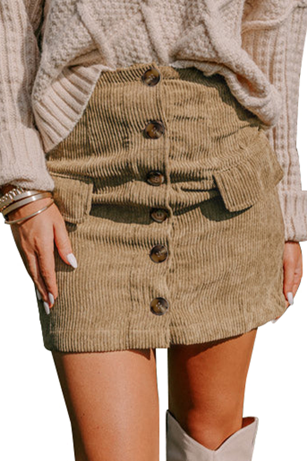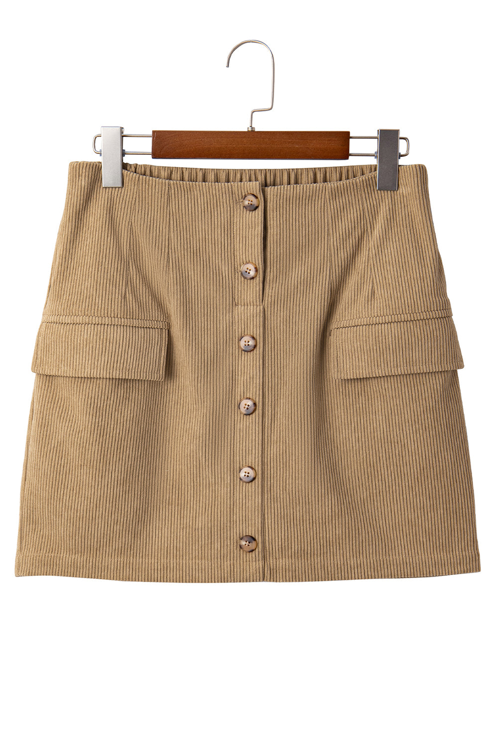Camel Corduroy Buttoned Front Faux Pockets Mini Skirt
